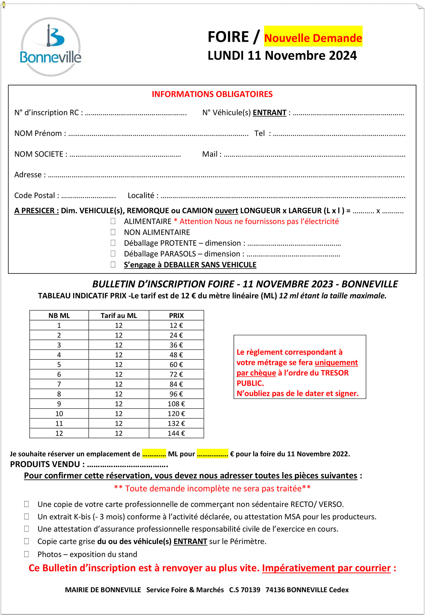 Cette date du 11 novembre représente la fin du cycle agricole annuel. Ce petit rappel historique pour signaler que les rues de Bonneville sont entièrement emplies par plus de 600 exposants, amateurs et professionnels qui vous proposeront toute sorte de bonnes affaires : de l'alimentaire à l'équipement de la personne, sans oublier la déco. ou le linge de maison... Sans oublier de nombreuses animations, la présence d'associations locales... Envie d'exposer à la foire ? Inscrivez-vous avant le 21 octobre 2024.